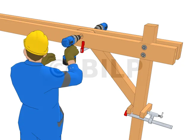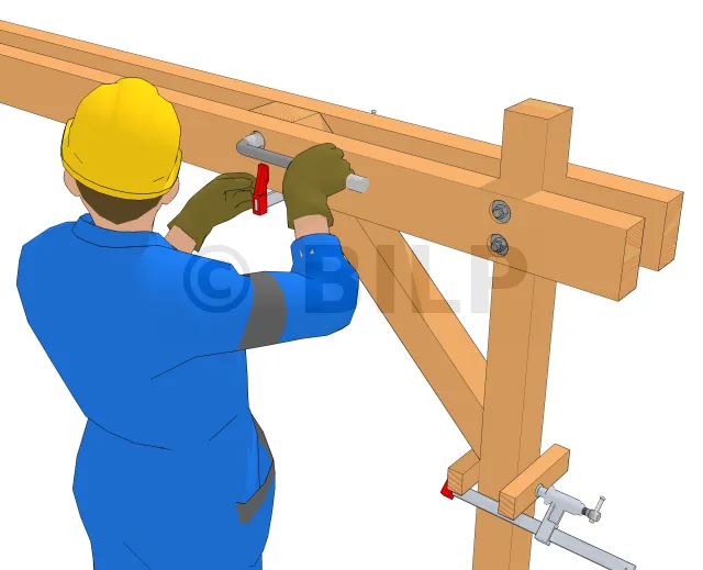 - 2: Positionieren Sie eine 2. Schraubzwinge unter dem Arm, die an den Pfetten für das andere Ende befestigt ist.