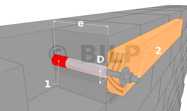 Bei der chemischen Dichtmasse in festem Material (Vollziegel, Beton, massiver Schlackenblock, Stein usw.) werden Gewindestangen mit speziellem Dichtharz verankert. Sie wird bei verschiedenen Arten der Befestigung einer Holzkonstruktion verwendet; zu erwähnen ist nur die Befestigung des Pfostenträgers in Beton, die Befestigung eines Mauerbalkens, eines Balkenschuhs oder eines beliebigen Zubehörs an einer Fassade mit festem Material usw.