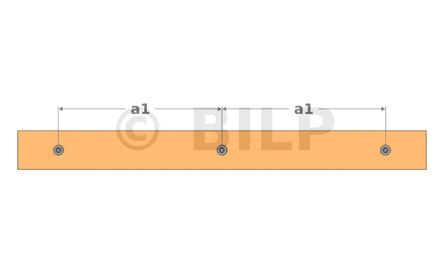 Bei der Berechnung des Mindestabstandes a3 dieser Stange vom Ende des Wandbalkens haben wir einen Wert von 80 mm; wir werden uns aber stattdessen für einen Abstand von 100 mm entscheiden. Lassen Sie uns dann den Abstand zwischen den Stangen aus der Anzahl der benötigten Balken berechnen. Dann wird die verbleibende Länge (Gesamtlänge - Abstand zu den Enden) durch die Anzahl der Stangen dividiert; das Ergebnis ist ein Abstand von 162 cm ((500 cm - (2 x 7,5 cm))/3). Nach dem Eurocode-Berechnungsprinzip ist die Sicherheit bereits eingeschlossen, aber für weitere Vorsichtsmaßnahmen wird der Abstand von 100 cm nicht überschritten, was uns dazu veranlasst, einen weiteren Stange hinzuzufügen und einen Abstand von 97 cm zu haben; die endgültige Anzahl der Stangen ist somit gleich 6.