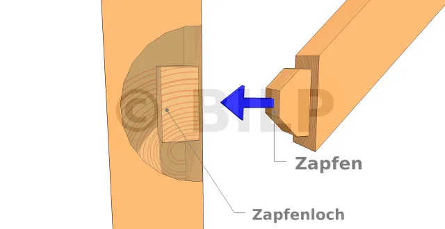 Hinweis : Es ist wichtig zu beachten, dass die Verbindungen durch Zapfen und Zapfenloch bei Arbeiten im Freien (Pergola, Terrasse,...) verboten sind, da bei schlechtem Wetter Wasser in den Zapfenloch eindringen kann. Da es keinen Wasserabfluss am Zapfenloch gibt, wird das Wasser stagnieren und kann das Holz verrotten lassen und damit die Struktur schwächen. Daher ist es bei Arbeiten im Freien vorzuziehen, sich für eine andere Art der Montage zu entscheiden (Montage mit Schrauben, Gewindestangen usw.).