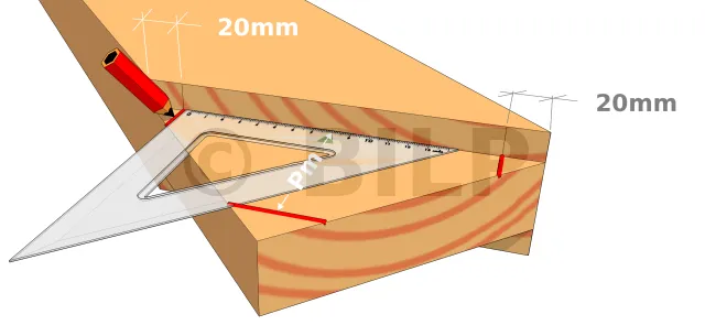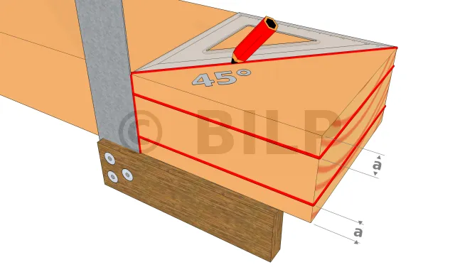 Zeichnen Sie die Schnittlinien wie in der obigen Abbildung gezeigt. Diese ist eine 45° Montage, aber sie kann ein anderer Winkel gebildet werden.