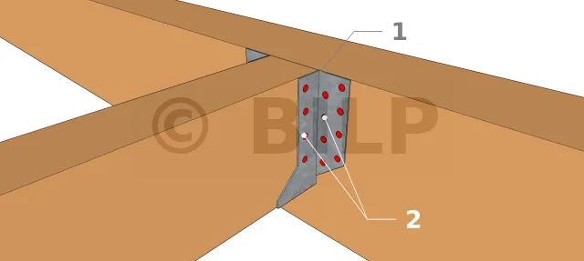 - Die fünfte Methode ist die Verwendung von verstärkten Winkelverbinder. Diese Technik ermöglicht die Befestigung der Balken sowohl an den Enden als auch an den Zwischenteilen. So können die Winkelverbinder mit D5-Schrauben oder sogar mit D4-Nägel befestigt werden. (Beachten Sie, dass diese Technik sehr solide Winkelverbinder erfordert.)