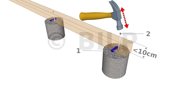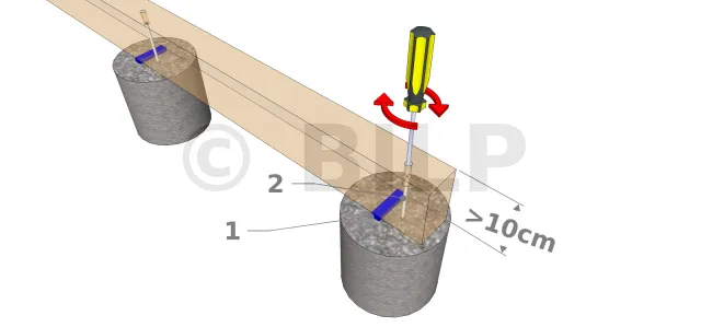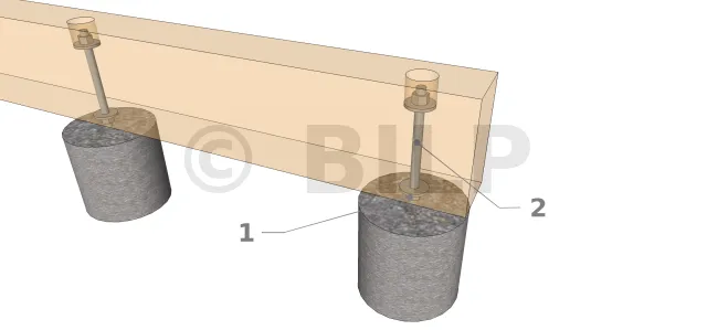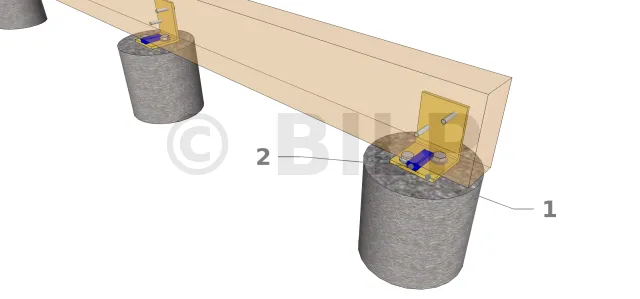 Es ist das kostengünstigste Befestigungsmittel. Der Unterzugbalken wird mit Betonschrauben, Schlagdübeln, Metallankerdübeln oder durch chemische Dichtungs-Dichtmasse am Betonsockel befestigt. Der Unterzugbalken wird mit Ankerdübeln oder Schrauben am Unterzugbalken befestigt, je nach den im Winkelverbinder vorgesehenen Löchern. Kunststoffkeile sind notwendig, um die Horizontalität des Unterzugbalkens zu justieren und seine Unterseite zu belüften.