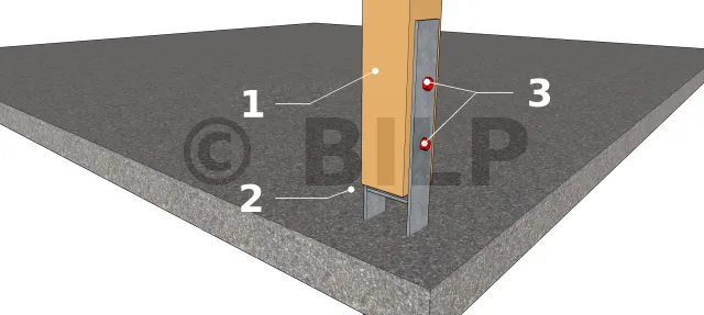 Es handelt sich um ein Befestigungsmittel für Pfosten, aber es kann auch zur Befestigung kleiner Pfosten verwendet werden. Die Stahlplatte wird mit zwei Sechskantkopf Gewindeschneidschraube an dem Pfosten befestigt, im Gegensatz zum Sockel, der mit einer Gewindestange, die mit chemischem Dichtungsmasse im Beton versiegelt ist, an der Betonplatte befestigt wird. Sie kann paarweise auf einer Pfosten verwendet werden. Diese Technik hat mehrere Vorteile, nämlich die niedriege Verankerung, die auf 45 mm breiten Rahmenpfosten verwendet werden kann, die Tatsache, dass sie eine feste Verankerung der Holzrahmenwand im Boden ermöglicht (empfohlen in seismischen Zonen) und die Verbindung Pfosten - Untergurt verstärkt, indem sie das Anheben des Pfostens verhindert. Auf diese Weise erfolgt die Energieableitung in der Platte an der Naht. Sie hat jedoch den Nachteil, dass sie nur für kleine Abschnittspfosten geeignet ist und auch nicht erlaubt, den Pfosten aus der Reichweite des Wassers anzuheben.