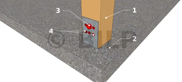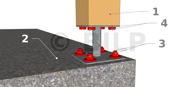 Dieses Element ist eine Mischung aus Pfostenträger auf zwei Platten für den oberen Teil und einem abzudichtenden Pfostenfuß für den unteren Teil. Der Pfosten wird mit 4 Sechskantkopf Gewindeschneidschrauben befestigt, während das Ankereisen in der Betonplatte mit chemischem Dichtmasse versiegelt wird. Diese Technik kann für Veranda, Pergola und Vorzeltpfosten verwendet werden. Es hat den Vorteil, dass es unauffällig ist und die Höhe vor der Versiegelung eingestellt werden kann. Nach der Anpassung ist diese Höhe jedoch endgültig und erlaubt es daher nicht, den Pfosten außer Reichweite des Wassers zu setzen. Die Installation des Pfostens kann entweder vor oder nach der Befestigung des Pfostenträgers an der Platte erfolgen. Es ist möglich, dass die Belastung der Struktur nach einiger Zeit zu einer Bewegung des Dichtstoffs führt.