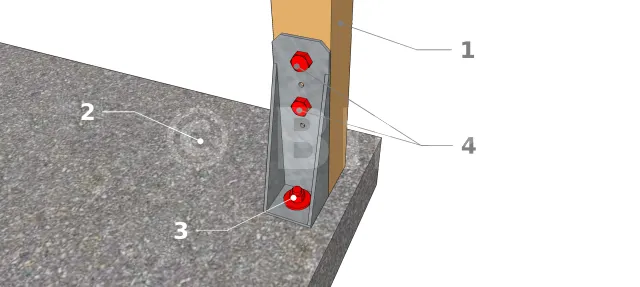 Es ist die gebräuchlichste und wahrscheinlich die kostengünstigste Pfostenbefestigung. Sie besteht aus der Befestigung der oberen Platte am Fuß des Pfostens mit Sechskantkopf Gewindeschneidschrauben. Die Befestigung der unteren Platte an der Betonplatte erfolgt durch Gewindestangen mit chemische Dichtmasse, Ankerdübel, Verlängerungsdübel oder noch besser durch HECO MULTI-MONTI-Schrauben. Sie wird oft für die Befestigung von Holzpfosten aller Art verwendet, sei es für eine Hütte, einen Pavillon, eine Garage usw.... und hat neben der großen Beliebtheit bei Heimwerkern auch den Vorteil, dass sie in großen Räumen sehr häufig verwendet wird. Man wird daran denken müssen, den Pfosten am Pfostenfuß zu befestigen, bevor man ihn dauerhaft im Boden verankert.