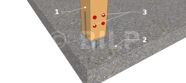 Diese Technik besteht darin, das Ankereisen des Säulenfußes direkt beim Gießen der Platte einzusetzen oder mit chemischem Dichtungsmittel abzudichten. Für den Pfostenteil wird der Dolle in eine mittig in dem Pfosten angebrachte Kerbe eingelegt und mit Sechskantkopf Gewindeschneidschrauben daran befestigt. Beachten Sie, dass die obere Platte nicht in Kontakt mit der Betonplatte stehen darf. Daher muss ein Raum von maximal 5 cm gelassen werden, um den Pfosten zu isolieren und den Kontakt mit Wasser zu verhindern. Diese Art von Pfostenträger wird verwendet, um die Pfosten vor Fäulnis zu schützen, wie im Falle einer Markise, Veranda, Pergola, Terrasse oder Konsole. Sein Vorteil ist, dass sie im angehobenen Zustand eine Tragfähigkeit bietet und dank der einbetonierte Stange eine verstellbare Höhe ermöglicht. Darüber hinaus wird die Diskretion verbessert, so dass der Pfosten außerhalb der Reichweite von Wasser platziert und vor oder nach der Verankerung des Pfostenträgers befestigt werden kann. Sie hat jedoch einige Nachteile, wie zum Beispiel die Tatsache, dass sich die Dichtung durch die Belastung der Konstruktion nach einiger Zeit verschieben kann oder dass nach Fertigstellung der Dichtung keine Höhenverstellung mehr möglich ist.