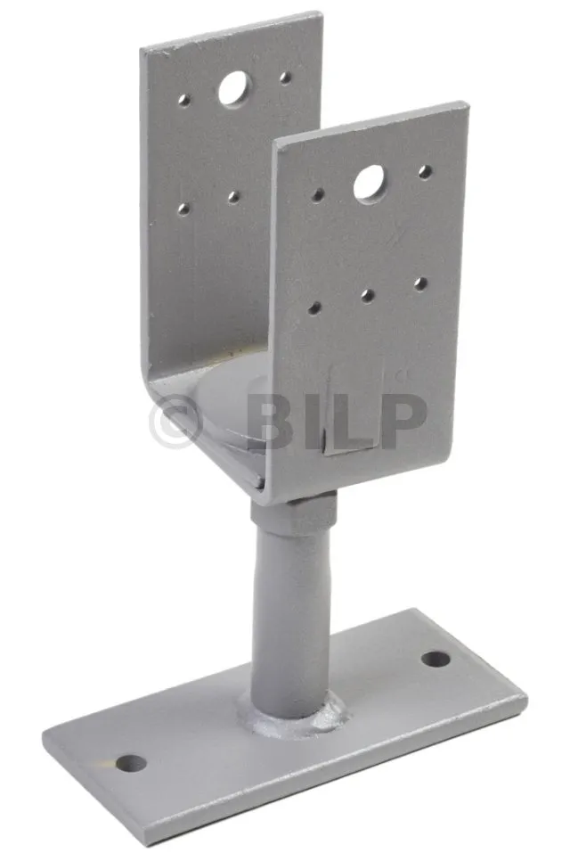 - U-Pfostenträger oder mit Platte : das einzutreibende Teil ist eine Gewindestange, die in Beton verankert wird. Es gibt verstellbare oder feste. Die U-Form erweckt mehr Vertrauen, da der Pfosten zwischen zwei Metallplatten eingeklemmt ist. Diese Verbindungselemente sind für leichte Strukturen auch auf schrägem Boden geeignet.