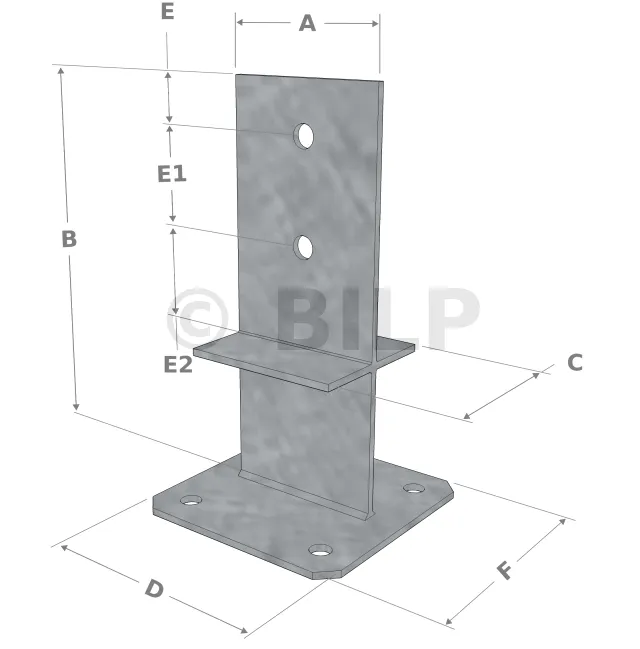 | A (mm) | B (mm) | C (mm) | D (mm) | E+E1+E2 (mm) | F (mm) | Dicke (mm) | Anzahl der Lôcher in der Trägerplatte | Anzahl der Löcher in der Bodenplatte |