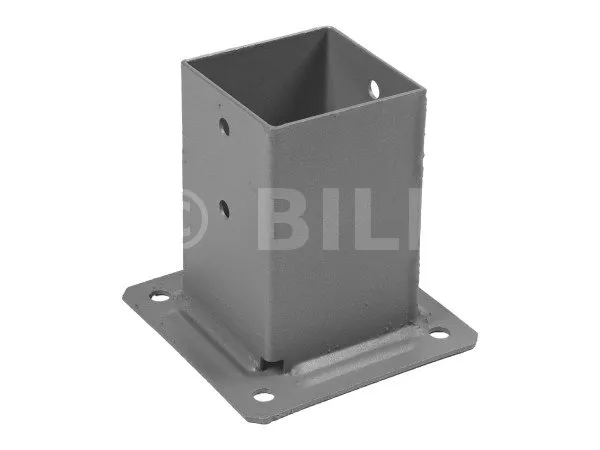 Die Wahl der Befestigungen hängt a priori von der Art des Untergrunds ab. Der Sockel kann aus Beton oder einer Holzplattform oder einfach in den Boden eingelassen sein ; gleichzeitig hängt er auch vom Querschnitt des Pfostens ab, ein einzutreibender Anker hat eine maximale Öffnung von nur 51 x 101 mm Seiten, ein H-Verbinder einen Raum von 121 mm, während Stützenfüße mit Platten Stützen größer als 130 x 130 mm tragen können.