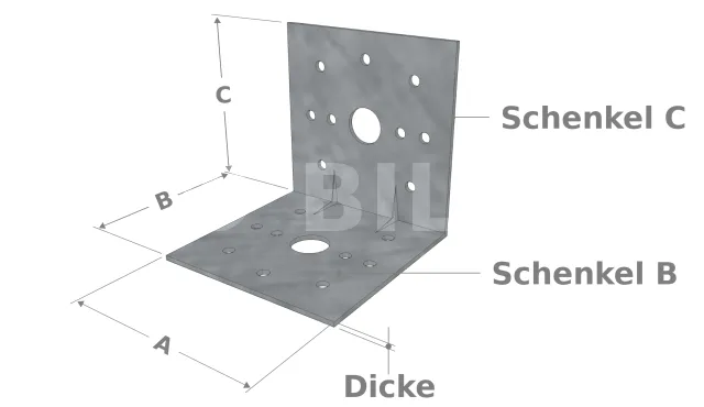 Bezeichnung : ein einzelner Winkelverbinder besteht aus zwei Platten B und C und verschiedenen Löchern, um ihn direkt an den zu montierenden Teilen befestigen zu können.