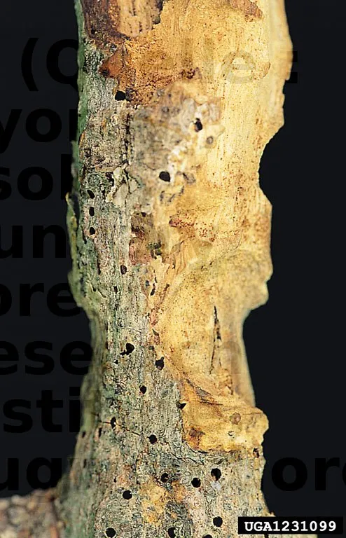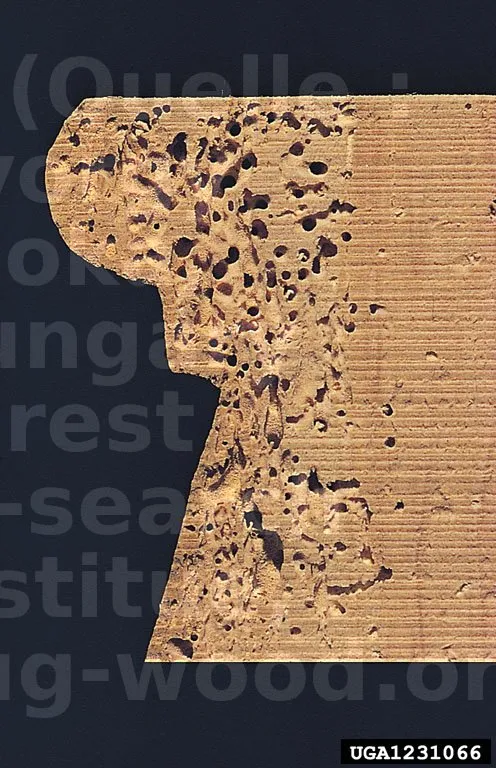 Entstehende Schäden : runde Ausfluglöcher mit scharfen Kanten, 1 bis 2 mm breit. All dies gefährdet die Widerstandsfähigkeit des Holzes.