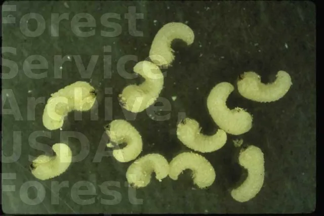 Die Larve ist 15 bis 30 mm lang (schönes Tier!). Sie ist elfenbeinfarben und ihr Körper ist am Kopf breiter als am Unterleib. Die drei Beinpaare am