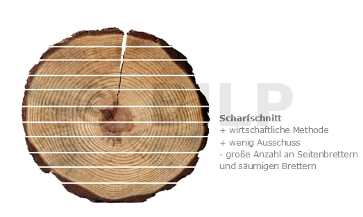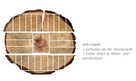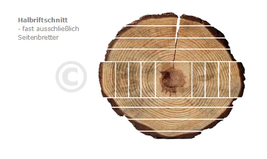 In Brettern aus Tangentialschnitten(Seitenbretter) verlaufen die Jahrringe hauptsächlich parallel zur Breite des Brettes. Diese Bretter sind während des Trocknens anfälliger für Verformungen als Brettern aus Radialschnitten. In Brettern aus Radialschnitten (Mittel- und Kernbretter) liegen die Jahrringe hauptsächlich quer zur Breite des Brettes. Dies sind erstklassige Bretter.