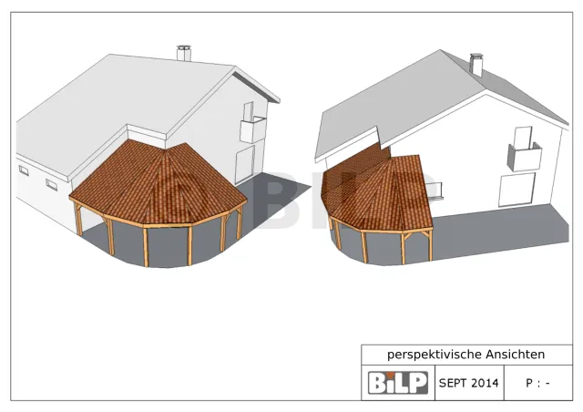 Perspektivische Ansichten ermöglichen es Ihnen, sich schnell in Bezug auf die Struktur zu positionieren und sich durch den Rest der Pläne zurechtzufinden. Die 4 Himmelsrichtungen werden im Allgemeinen verwendet, um sie zu benennen, nämlich NORD, SÜD, OST und WEST. Es ist möglich, diese Ansichten mit einem echten Bild auf dem Feld einzufügen.