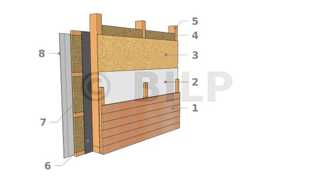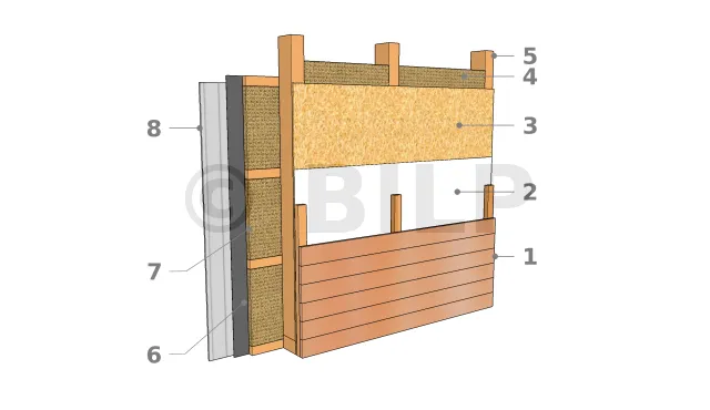 Wände mit doppelter Dämmung und zusätzlicher Dämmung von innen unterscheiden sich in der Position der Aussteifungsplatte, der Dampfbremse und ob eine starre Unterspannbahn auf der Außenseite erforderlich ist oder nicht. Dies liegt daran, dass sich die Aussteifungsplatte an der Außenseite oder zwischen den beiden Dämmungen befinden kann. Die Dampfbremse kann sich zwischen den beiden Dämmungen oder auf der Innenseite befinden. Befindet sich die Versteifungsplatte zwischen den Dämmungen, ist eine starre Unterspannbahn erforderlich.