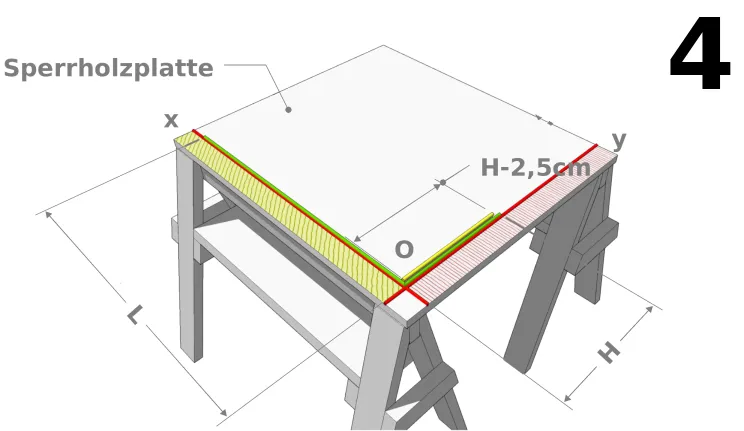 - Dann überträgt man vom Punkt O aus die später auf der (y)-Achse gemessene Länge L auf den Boden.