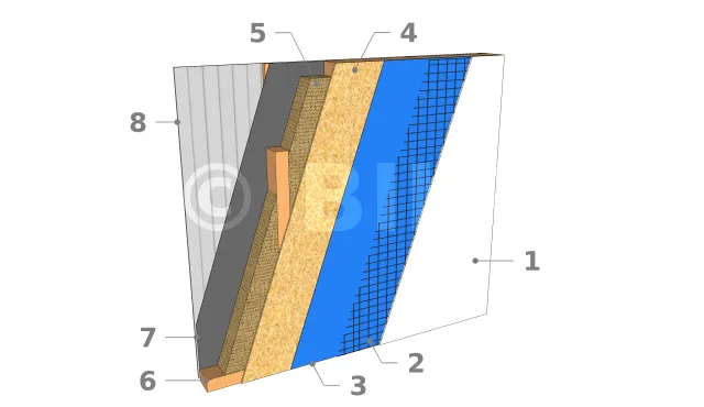 Die hydraulische Putzbeschichtung wird direkt auf die Drahtgewebe aufgebracht, die durch die Aussteifungsplatte und das Isolierpapier mit dem Rahmen verbunden ist. Das Dämmpapier muss in der Lage sein, Wasser wie die Unterspannbahn zurückzuhalten und gleichzeitig der Feuchtigkeit zu widerstehen, die die Beschichtung im Laufe der Zeit je nach äußeren Bedingungen haben kann. Das Dämmpapier sollte entsprechend den Empfehlungen des Lieferanten sowie der Wahl dieses Wandtyps richtig ausgewählt werden.