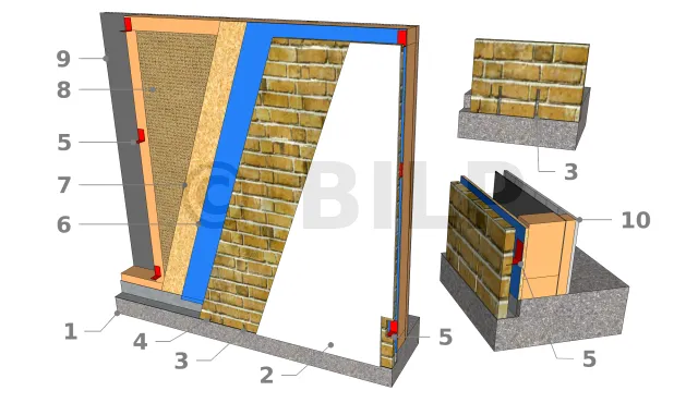 - 4 : Zweischaliges Mauerwerk mit einem Luftschicht von mindestens 2,5 cm Dicke