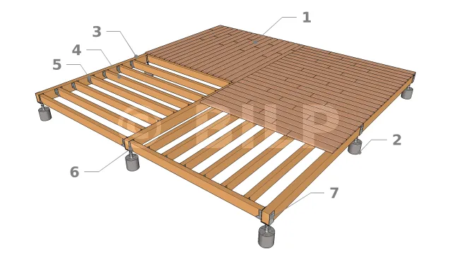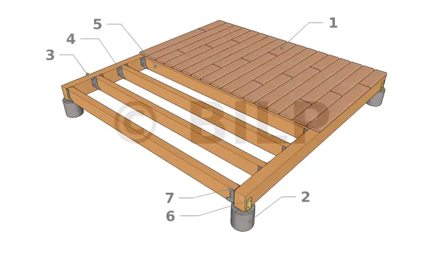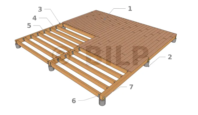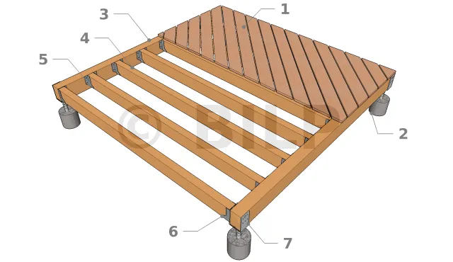 Diese Form der Plattform entspricht einer rechteckigen oder quadratischen Struktur, sie besteht aus einem Deck, mit Belag, mit Terrassenddielen ohne Verzahnung oder Paneele, einem Gerüst aus Balken und Tragbalken.