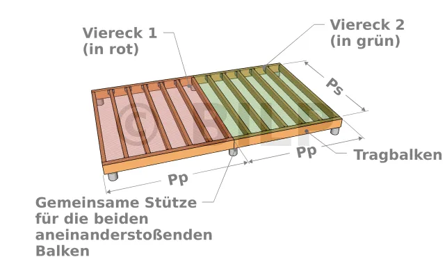 dem nebenstehenden Beispiel beträgt die Länge des Tragbalkens 250 cm, aber seine Spannweite beträgt nur 210 cm. Es ist daher notwendig, einen Zwischensockel hinzuzufügen, um die Spannweite "sicherzustellen". Es gibt zwei Quadrilaterale, auch wenn am Ende nur ein Strahl steht.