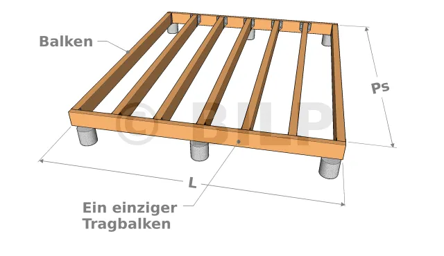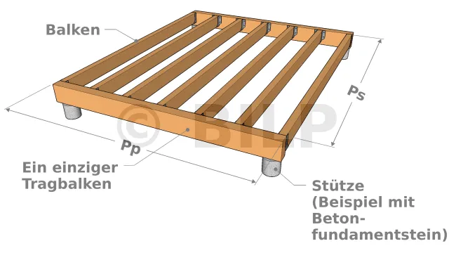Die einfachste Lösung besteht darin, im Falle einer einfachen Plattform mit einem einzigen Viereck an jeder Ecke der Struktur einen Sockel anzubringen. Dies ist möglich bei kleinen Konstruktionen und wenn die Tragbalken der Holzplattform einen ausreichenden Querschnitt haben. Im Falle einer Plattform mit mehreren Vierecken gibt es an jeder Ecke des Vierecks eine Stütze. Tatsächlich bestimmen die Stützen die Größe des Vierecks.