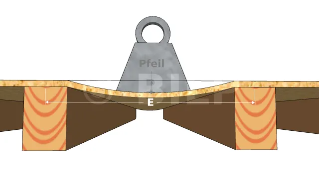 Der Achsabstand E, d.h. der Abstand zwischen den Achsen zweier paralleler Balken. In Wirklichkeit berechnen wir den Rand-zu-Rand-Abstand, d.h. den Abstand im Hohlraum zwischen zwei Balken. Der Einfachheit halber betrachten wir diesen Abstand E jedoch als den Abstand von Achse zu Achse. Da letztere notwendigerweise größer ist, stellt diese Annäherung eine zusätzliche Sicherheitsmarge dar. Der Abstand hängt hauptsächlich von der zukünftigen Abdeckung ab, die auf den Balken anzubringen ist. Dieser Abstand wird in der Tat berechnet, um die Verformung des Bodenbelags zu begrenzen, der sich unter einer Last (Gewicht der Kabine, der Möbel, der Benutzer) durchbiegt. Diese Verformung wird als Durchbiegung bezeichnet. Sie wird oft als Anteil der Entfernung oder Spannweite ausgedrückt.
