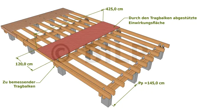Die Bestimmung der Eigenschaften von Tragbalken auf einer einfachen Holzplattform ist einfacher als bei Tragbalken, die eine tragende Wand tragen, da die zu berücksichtigenden Lasten (die Cp-Last) nur Betriebslasten und Dauerlasten aus Balken und Belägen sind.