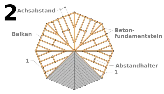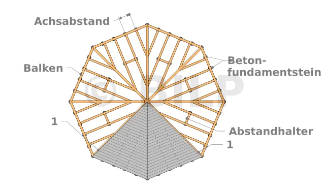 Der Querschnitt der Balken hängt von den Abmessungen der Plattform ab, die den Einbau einer ausreichenden Anzahl von Betonstützen bestimmt, sowie vom E-Achsabstand der Balken, der der Spannweite der Terrassendielen oder Holzplatten entspricht.